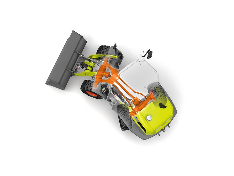 La TORION SINUS plie non seulement au milieu au niveau de l'articulation, mais aussi avec l'essieu arrière. Deux barres de direction relient la partie avant aux fusées d'essieu arrière. Dès que le conducteur met la chargeuse à pneus en braquage en tournant le volant, l'essieu arrière suit la direction demandée de manière synchronisée.