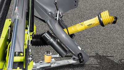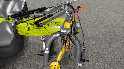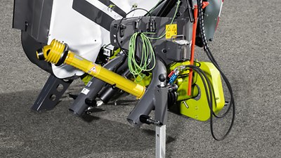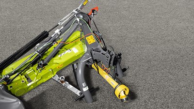 Outre la possibilité d'utiliser différentes catégories d'attelage et un cadre d'attelage Quickhitch, l'axe de bras inférieur gauche est positionné un peu plus bas pour faciliter l'attelage. Pour un confort de maniement accru, la faucheuse est dotée d'un support d'arbre à cardans pivotant, mais aussi d'un rangement intégré pour connecteur et conduites hydrauliques.