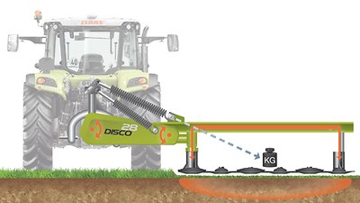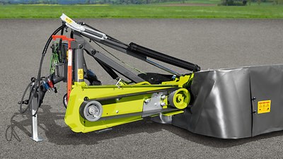 Sur les faucheuses arrière DISCO, une sécurité mécanique protège le lamier. L'axe de pivot incliné de 15° au centre du groupe de fauche lui permet de se relever et de passer au-dessus de l'obstacle. Pour reprendre le travail, il suffit de la remettre rapidement en place.