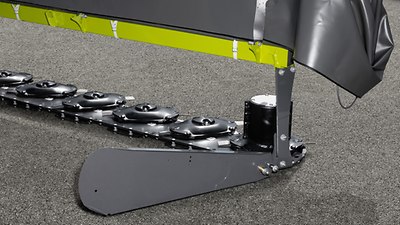 Les deux moitiés de la toile de protection peuvent être repliées en tout confort vers le haut de manière à permettre un accès optimal pour les opérations de maintenance et de nettoyage. En cas d'endommagement du bord extérieur de la faucheuse, la toile de protection concernée peut être échangée séparément.