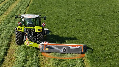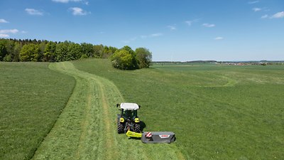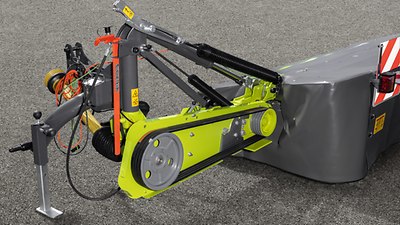 La faucheuse est entraînée par des arbres à cardan requérant une maintenance minime. La robuste transmission par courroie minimise les pics de charge et peut être tendue sans outil via un bouton rotatif. La force est alors transmise via un réducteur double qui assure l'entraînement à l'entrée du lamier, juste au-dessus du premier disque de coupe – un sabot intérieur n'est pas nécessaire et le flux de fourrage est optimal.
