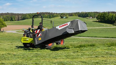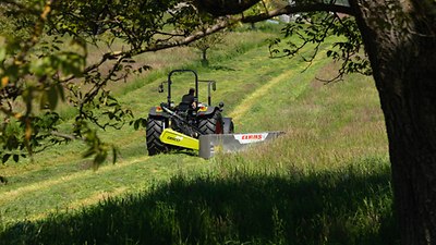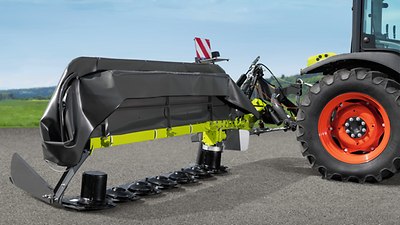 Lorsqu'une unité de fauche s'approche d'un obstacle, la protection contre la surcharge intervient et la machine peut pivoter vers l'arrière. Il suffit d'une brève marche arrière pour repartir. Le bord extérieur de la faucheuse est en outre protégé des dégradations par un arceau supplémentaire.