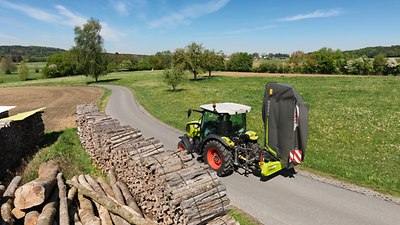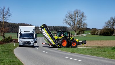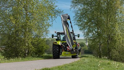 Pour rejoindre la prairie suivante, la faucheuse est positionnée pour rapprocher son centre de gravité au plus près du tracteur, sans dépasser une hauteur de 4 m. Grâce à son petit gabarit de transport, la faucheuse grande largeur franchit ainsi sans problème les entrées de parcelles les plus étroites.